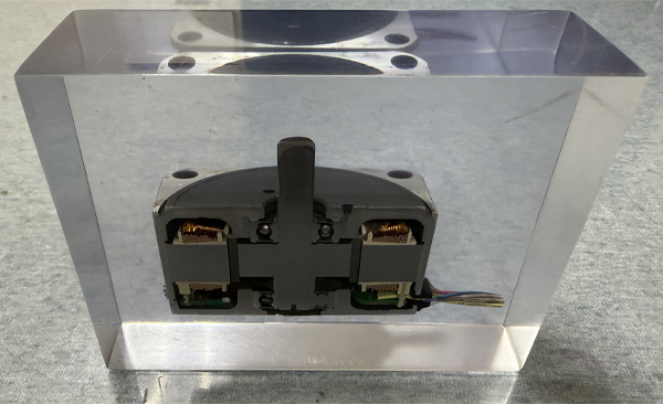 ■ 樹脂包埋(モールド)製作事例 コイルの極細線やベアリング、基板など、そのままでは切断時に飛散・変形してしまう複雑な機構も、専用樹脂で真空包埋。本来の空間配置を1ミリの狂いもなく保ったまま、精密な断面を露出させます。